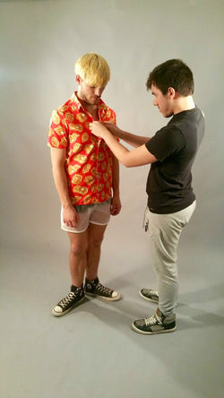 Sugoi Ne is a Japanese phrase that translates roughly into the American "awesome." This collection is the first under the 199X|AD label, and it draws inspiration from popular contemporary trends in the Shibuya ward of Tokyo, Japan. Shibuya is known for being the heart of Japan's street fashion scene. The garments in the collection include food prints symbolizing the "kawaii cafe" trend in Tokyo, where pancakes and waffles are marketed as delicate desserts. Dragon print shorts resemble Japan's kaiga paintings throughout history. Mesh, vinyl, and tribal prints were also used to emphasize Shibuya's unique trends not seen in the US.